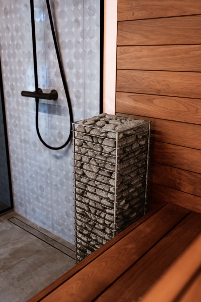The name and design of the CLIFF electric sauna heater stem from Nordic cliffs. The slim shape of the sauna heater and exterior surfaces that expose dozens of natural sauna stones ensure that it’s an eye-catching element in the wooden interior of the steam room.