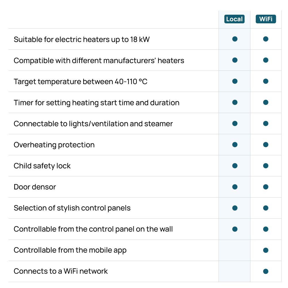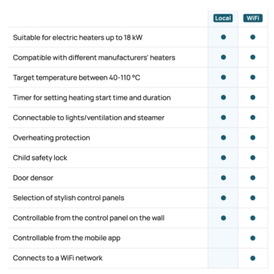 You can also connect the sauna lighting, ventilation, and steamer to the control system for added convenience. Overheating protection and a child lock take care of the safety of your sauna. If you change your mind and want to control the sauna from the app, you can simply add Wi-Fi capability later.