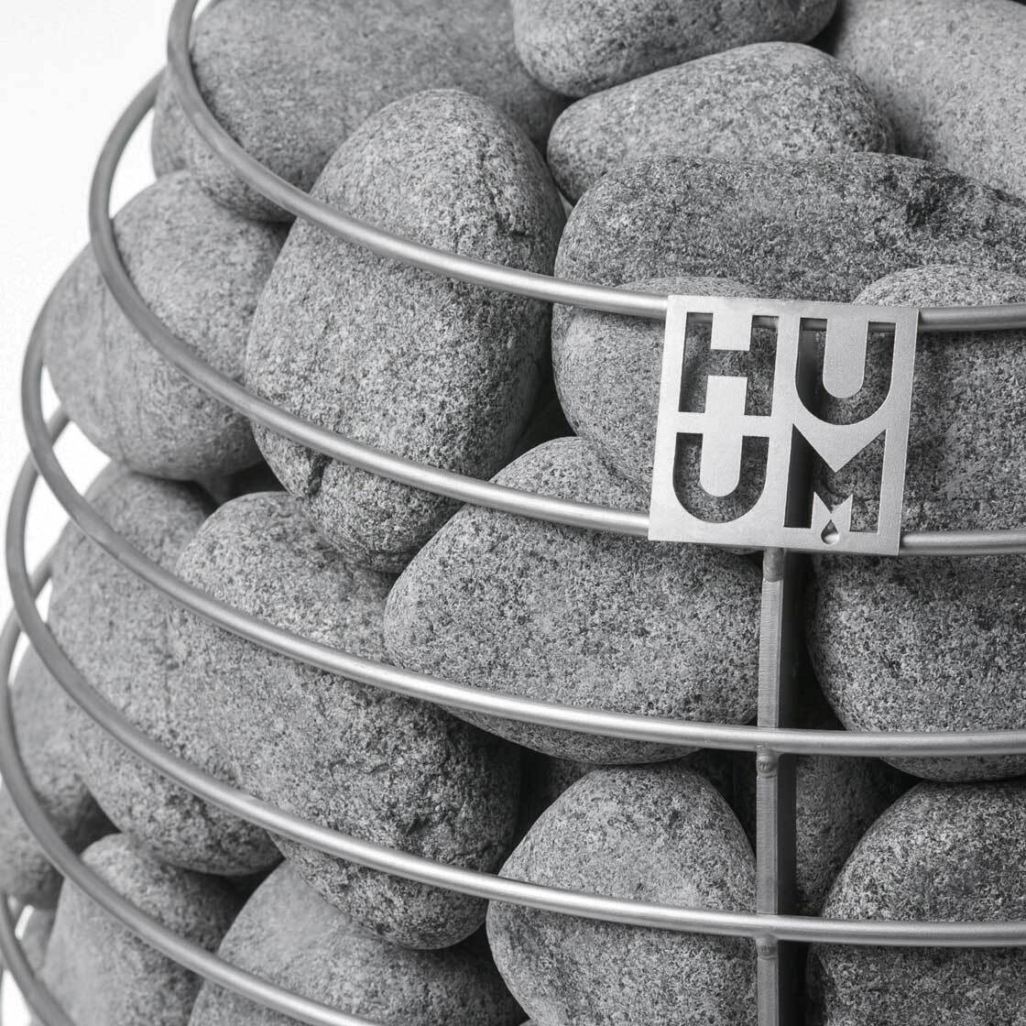 You regulate the heat and steam of the sauna by throwing water on the sauna rocks. The shape, size and composition of the stones, and their placement in the heater make all the difference. We recommend round sauna rocks because they provide milder steam. The round shape ensures that the water reaches inner stones and evaporates gradually instead of vaporizing in one go from the top layer. Sauna rocks are highly visible in HUUM sauna heaters, and you’ll need smaller and larger stones for filling the heater evenly without noticeable gaps. We suggest stacking a denser top layer with slightly smaller stones. This enhances the accumulation of heat.