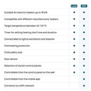 | Sauna controller | control panel + smart phone |